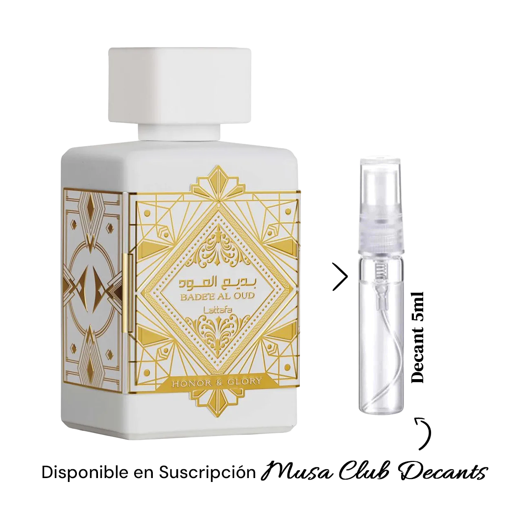 Badee Al Oud Honor & Glory de Lattafa, en su presentación decant de 5 ml, es una fragancia oriental que se destaca por su intensidad y carácter. La combinación de oud elegante, dulzura cremosa y especias cálidas crea un aroma profundo, moderno y con mucha presencia, ideal para quienes disfrutan perfumes potentes y sofisticados.
